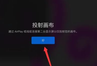 4.打开开关后,相关文本“Project Canvas,通过AirPlay或cable连接第二个显示器以仅投影您的画布”将显示在 procreate 屏幕上。只需点击“确定”按钮。