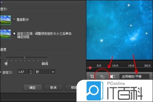 6、除了在效果里面点击添加缩放平移以外,还可以再预览窗口下面的三个叠加的方块,如图所示,直接开启添加缩放平移,然后设置,点击应用缩放平移即可,操作和前面差不多