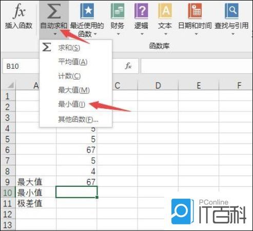 之后点击自动求和下方的下拉箭头,然后点击最小值;