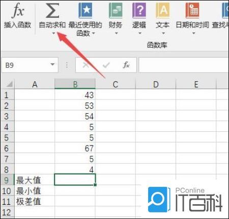 之后在极差值后面的单元格中输入=B9-B10,然后按回车键;