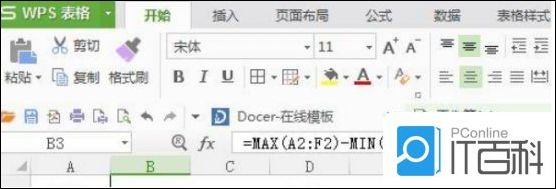 在想要实现Excel极差的表格中输入=max(B2:F2)-min(B2:F2),如图所示: