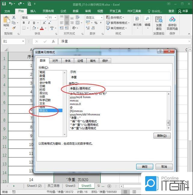3、在“设置单元格格式“左侧点击【自定义】,在右边的【类型】中的G/通用格式前面输入文字净重:,并【确定】;