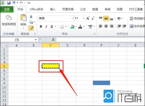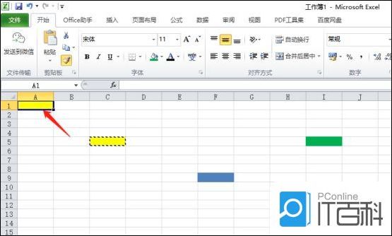 4.想要把单元格填充上颜色,就选中哪个单元格,在A1单元格上填充黄色,就点击A1单元格,单元格A1就被填充了黄色,如下图红色箭头指向所示: