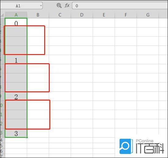 3、点完之后在“0”下面就出现了三个空白行,用鼠标将A1到A4单元格同时选定,然后把光标放在A4单元格的右下角,当光标变成黑色十字的时候,往下拉。