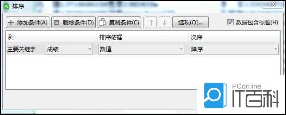 5: 点击排序,出现下图表格,在主要关键字里面选择成绩,排序依据下面选择数值,次序下面选择降序(如图所示)。