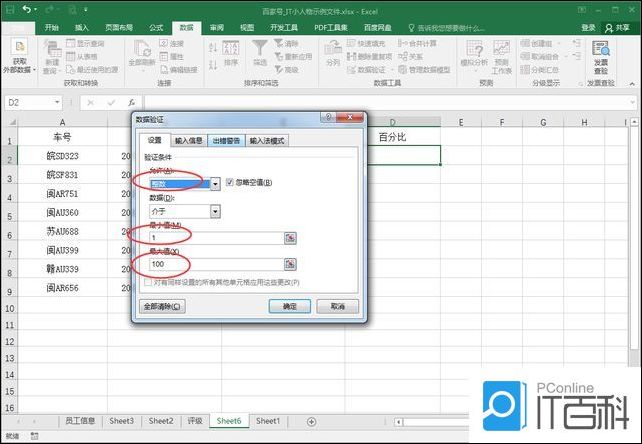 3、在“数据验证”界面中选择子项【整数】,在数据中输入最小值“1”,最大值“100”;