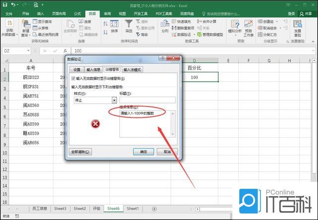4、点击【出错警告】中输入提示内容“请输入1-100中的整数”;