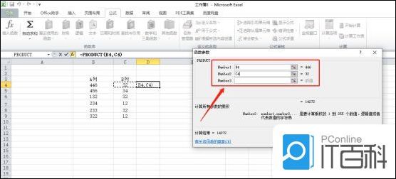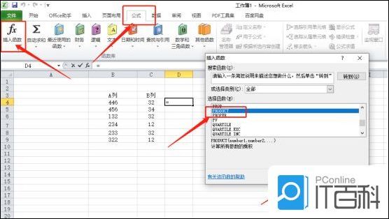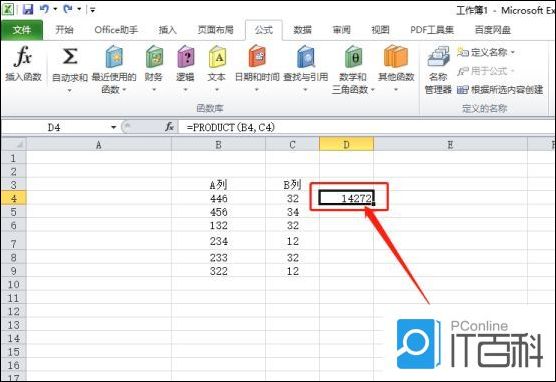 4.还可以使用里边的函数功能,选中D4单元格,点击菜单栏上边的【公式】-【插入函数】,在弹出的函数中找到【product】函数,点击【确定】,如下图红色圈出部分所示: