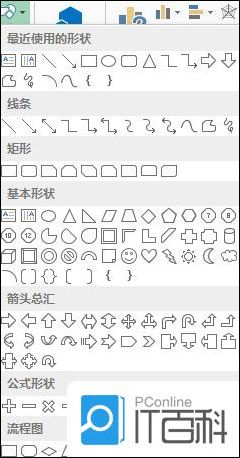 2、点击图形后,会弹出一个下拉菜单,我们可以根据需要选择要插入的图形形状,这些形状涵盖很多,圆形、矩形这些简单常见的形状,以及复杂的形状,比如箭头汇总、星与旗帜等等,如下图所示: