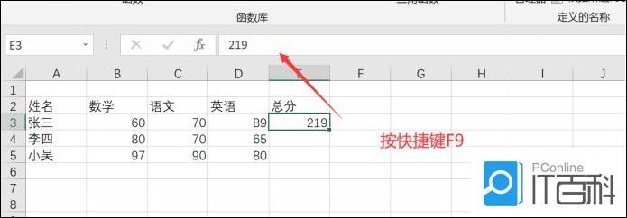 2.找到键盘上的功能键“F9”,点击,就能将单元格内的公式去除了,这样还保留了公式所得的数值,如图所示。