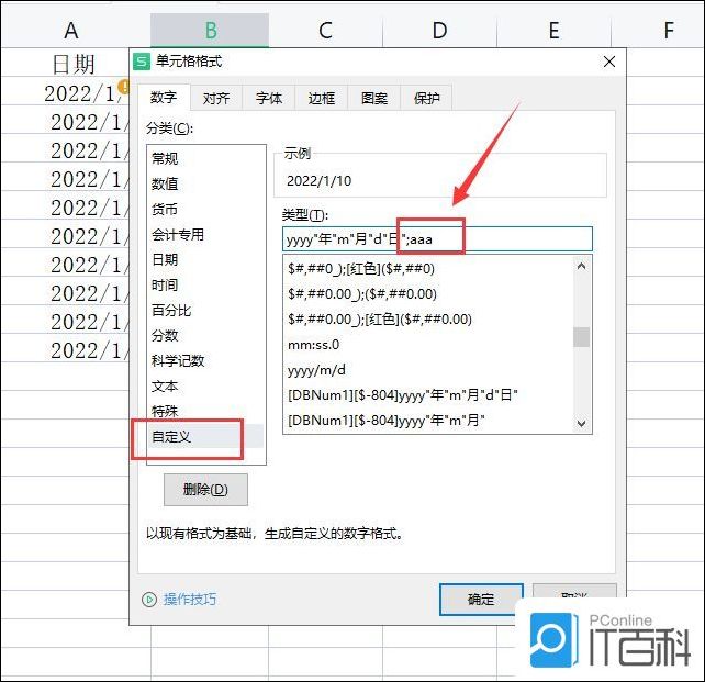 4、点击自定义,然后选择需要的时间格式,在后面加上【aaaa】,也可以加上【aaa】只显示星期后面的数字;