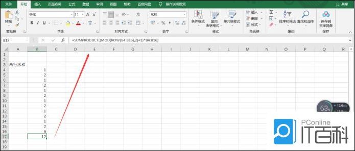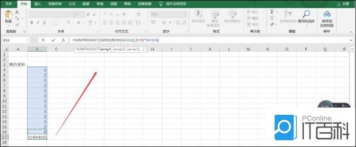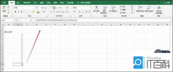 1.以如下数据为例,在B16中输入公式=SUMPRODUCT((MOD(ROW(B4:B15),2)=0)*B4:B15)再按回车键即可。