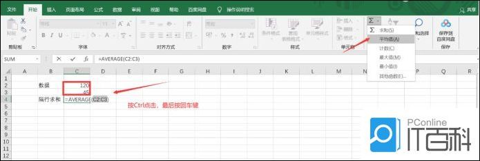 4.在上方开始功能栏中找到自动求和旁边的小箭头,之后点击求平均值,在用ctrl点击各自的数据进行求平均值,点击之后按回车。
