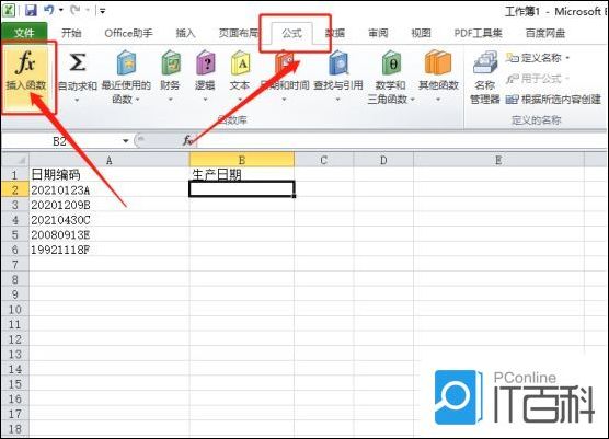 2.点击菜单栏上边的【公式】-【插入函数】按钮,如下图红色圈出部分所示: