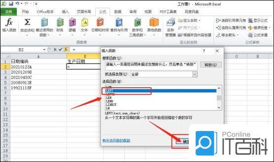 3.选择【LEFT】函数,这个函数的意义是从一个文本符串的第一个字符开始返回指定个数的字符,在点击【确定】按钮,如下图红色圈出部分所示: