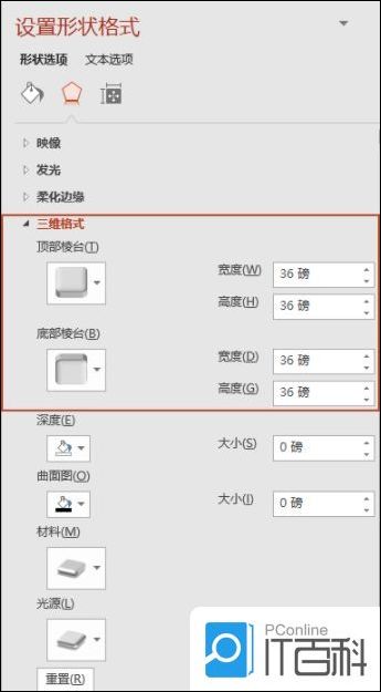 点击这个“五角星”,右键打开“设置形状格式”。选择“顶棱镜”和“底棱镜”的样式,“宽”和“高”的值,输入36点。(此处仅供参考,可以根据具体情况进行调整。)