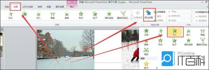4、点击菜单栏的动画选项,就会在顶部出现有很多动画效果,选择一张图片对应一个动画效果,可以有飞入、淡入、淡出、浮入等效果