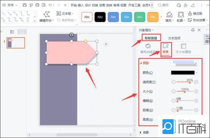 接下来,我们插入一个五边形,将其放置在左上角,设置形状选项-效果为阴影,并根据需要调整参数,如图所示。