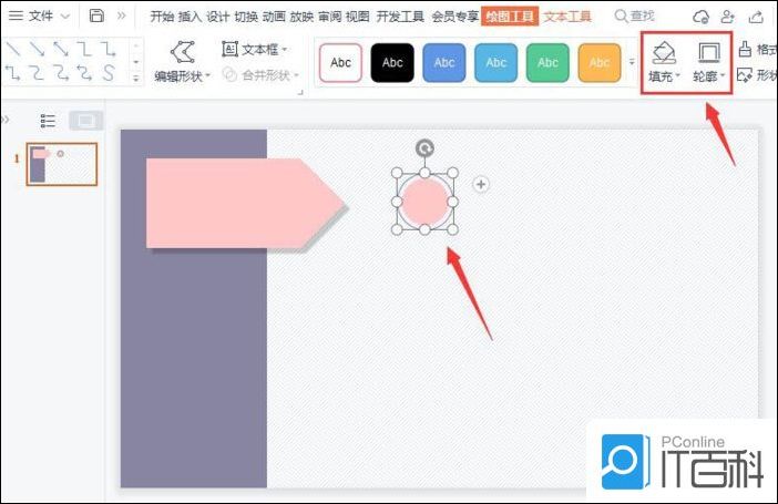 接下来,我们[插入]两个圆,内圆填充为粉色,外圆设置为紫色,如图所示。