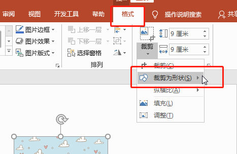2、然后点点击“ 格式” ,再选择 “裁剪“, ”裁剪为形状“