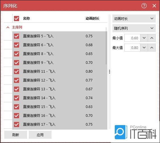 选择动画时长—随机序列,将最小值设置为0.6,最大值设置为0.8,勾选名称后点击应用。