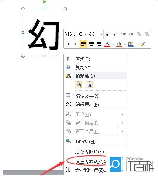 4、 右键单击文本框右下角,选择“设置为默认文本框”。