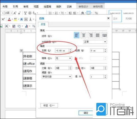 5.只需要将左侧缩进的值手动改为0,点击右下角“确定”即可。回到word文档页面可以看到表格中的文本已正常显示。