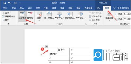 3.将光标放到刚才合并完成的单元格中,输入星期和时间,点击菜单栏中的【布局】,在“绘图”选项中选择绘制表格。