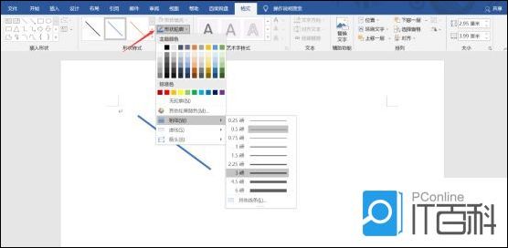 4.如果需要对该斜线进行设置,可以点击该斜线,选择“形状轮廓”即可更改斜线的颜色,或者点击“轮廓”中的“线型”也可以更改线条的粗细。