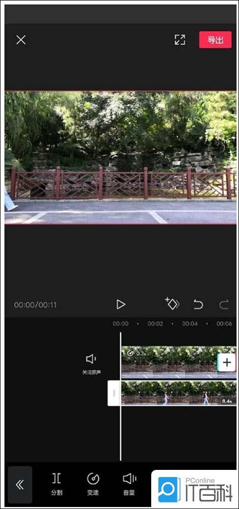 05拖曳画中画轨道使其与视频轨道左侧对齐,选中视频轨道,点击「变速J按钮。