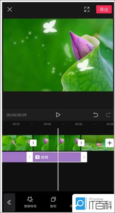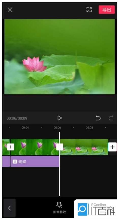 08拖曳时间轴至「蝴蝶」特效的结束位置处;点击「新增特效」按钮。