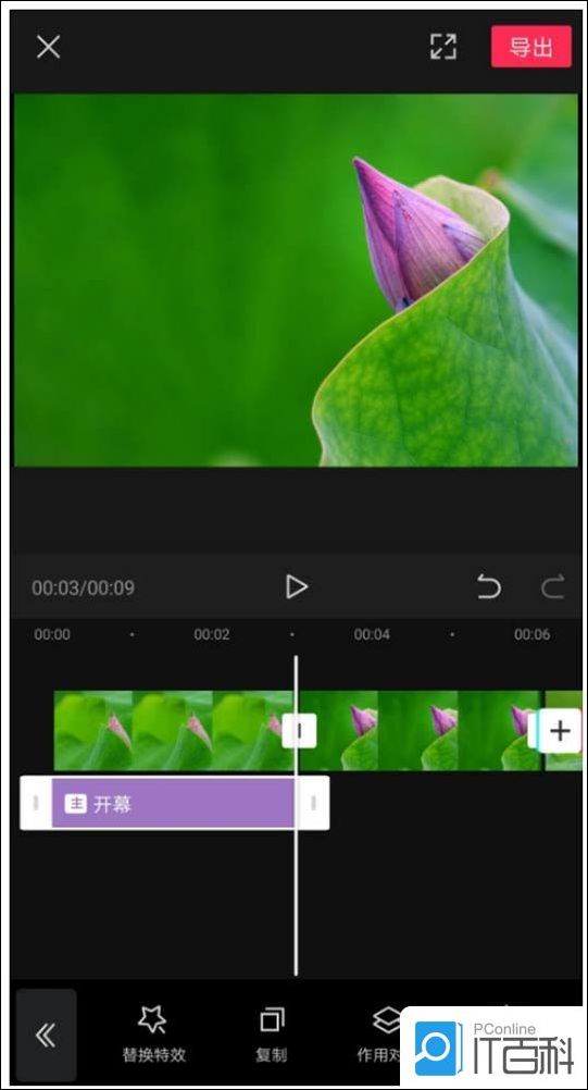 04选择「开幕」特效轨道,拖曳其时间轴右侧的白色拉杆,调整特效的持。