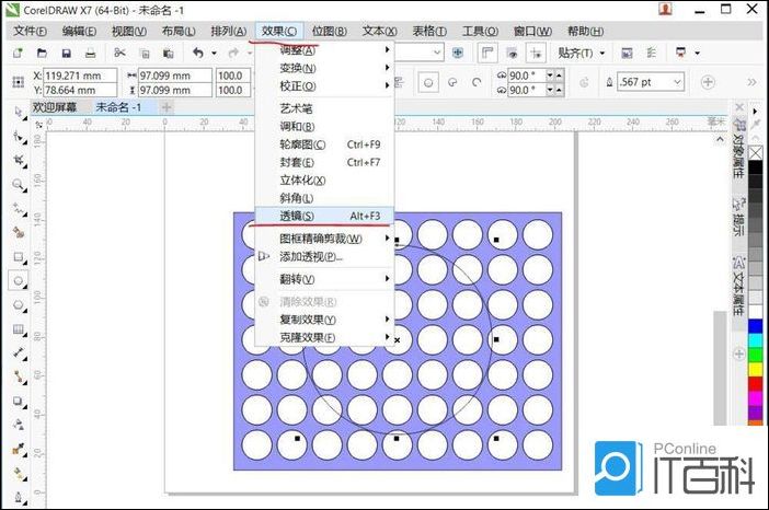 用椭圆工具在图形的合适位置绘制一个正圆,执行效果——透镜