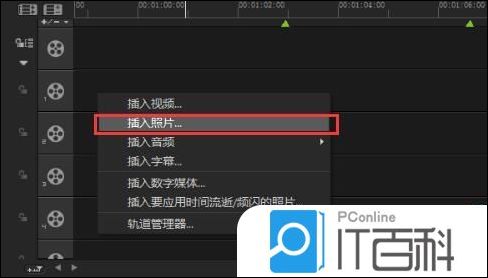 2、在覆叠轨1上右键单击,选择“ 插入照片 ”;