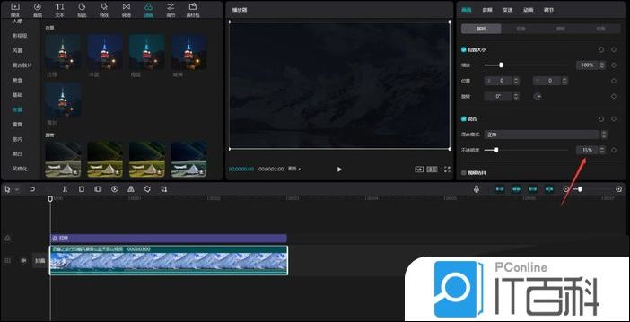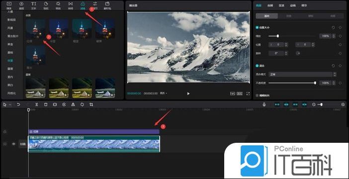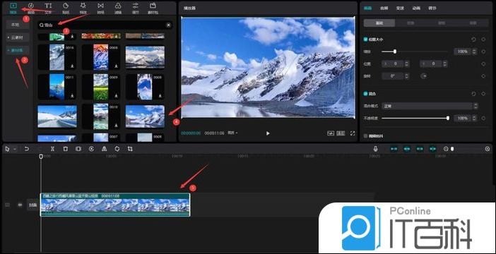 点击媒 体按钮 ,然后点击素材库按钮,在搜索栏中输入雪山两字,选 择一段视频,将 其添加到视频轨道中,见下图。