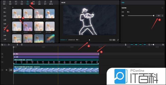 点击特效按钮,选择光中的 柔光特效 ,将其添加到特效轨道中, 更改强度为100 ,然后点击播放按钮就能看到效果了,见下图。