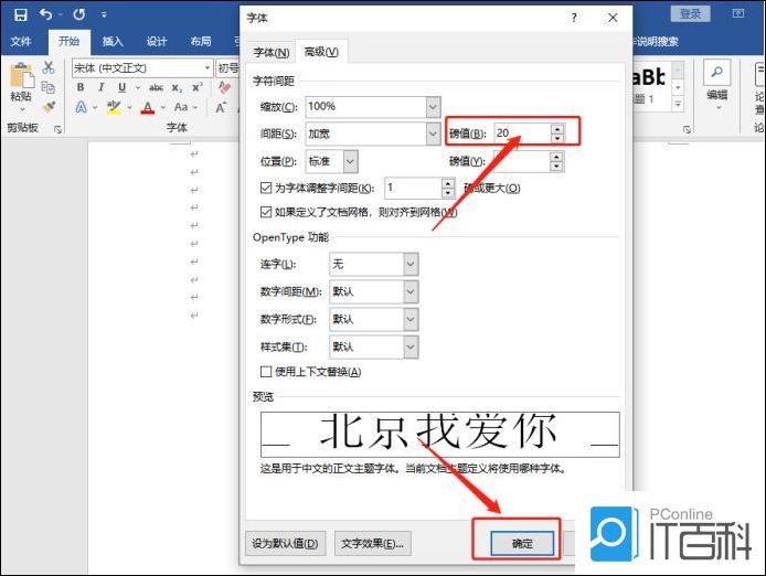 7、当然,也可以手动调整右侧的磅值,加宽字间距或紧缩字间距,通过下方的预览界面可以查看调整之后的效果。这里,我把【磅值】设置为【20】;并点击【确定】的按钮。如下图所示。