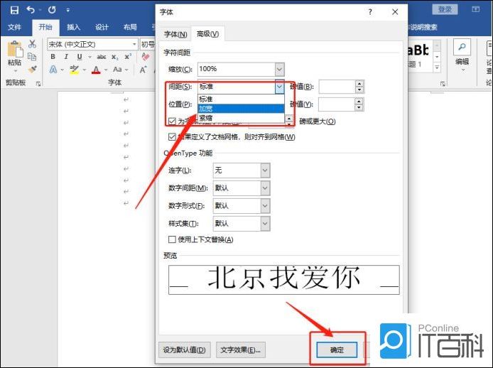 6、接着,【间距】中【标准】旁边的【小三角】,在下拉菜单中,找到【加宽】的选项,并点击【确定】的按钮。这样一来,可以在【预览】中看到字间距已加宽。