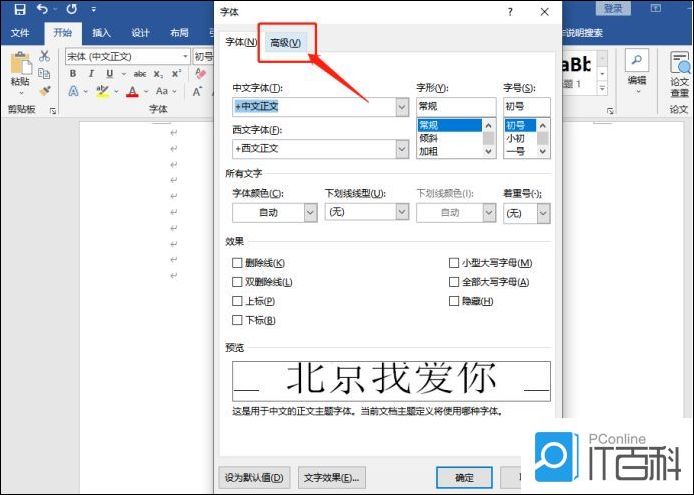 4、紧接着,点击【字体】的选项;然后,在弹出字体设置对话窗口,选择【高级】的选项。如下图所示。