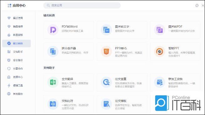 集成了输出转换、文档助理、安全备份、共享协作、资源中心、方便工具等实用功能,构建了丰富的“应用中心”,满足大家的各种办公需求。