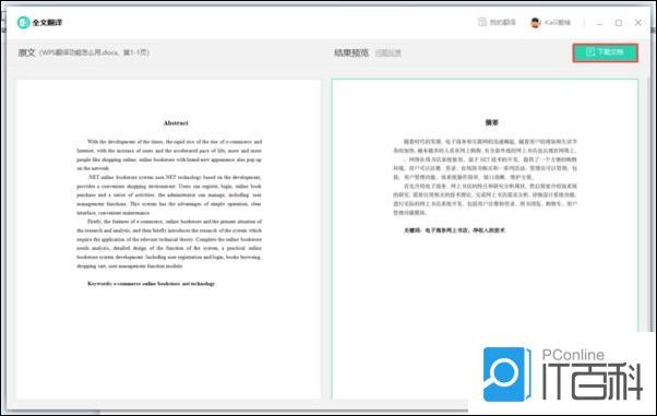 第七步,文档在翻译好以后,软件就会弹出文档【原文】与翻译【结果预览】的界面了,如果需要下载翻译后的文档的话,就点击窗口右上角的【下载文档】按钮来进行下载即可。