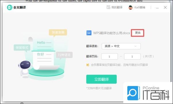 第三步,全文翻译功能安装好以后,软件就会弹出【全文翻译】的窗口,此时在文档的名字的右侧,有一个【更换】按钮,点击它,我们可以更换要翻译的文档。