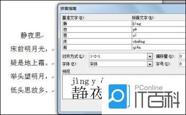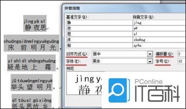 步骤四:如图设置好各项数据后,点击“确定”,就可以看到每一个字上边均标注了汉语拼音。其中“对齐方式”是指每个字的汉语拼音与汉字的排列格式;“偏移量”是指汉语拼音与汉字的间距,值越大,间距越大;“字体”和“字号”都是指的汉语拼音的字体和字号,与原文字体与字号无关。