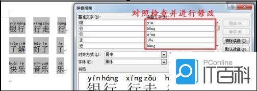 步骤七:对于一些多音字,当在词组里时候,Word一般能录入正确的读音。但是对于单字出现需要添加拼音的时候,一般会插入该汉字的所有读音中的第一个读音(按字母表排序),这时候需要在“拼音指南”对话框里检查并进行修改。