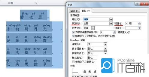 步骤六:在弹出的“字体”对话框的“高级”选项卡下,“间距”选择为“加宽”,设置适当的磅值,点击“确定”即可。