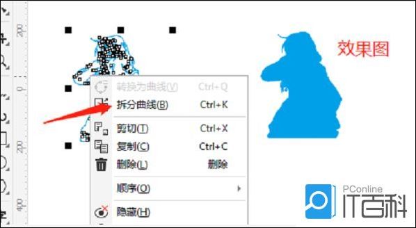 第六步,选中整个图形后,单击右键并选择【拆分为曲线】,就可以得到一个蓝色的图形对象。