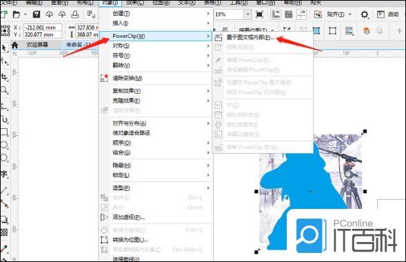 第七步,将得到的蓝色图形对象放置在原图上,使其与动漫人物图的位置相重合。然后,我们需要选中原始图像(确保选中的是原始图像,否则可能会导致后续操作无法找到对象)。在CorelDRAW的菜单栏中,找到【对象】并选择【PowerClip】,然后点击【置于图文框内部】。