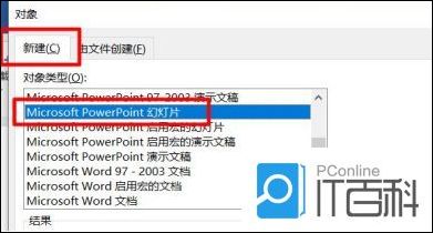 3. 在插入对象的窗口中,选择上方的“新建”选项卡,并选择下方的“Microsoft PowerPoint 幻灯片”一项。如下方图片红色圈中部分所示: