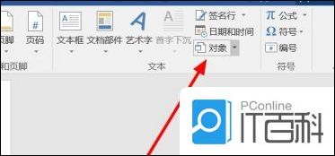 2. 在插入选项卡下,找到并点击“对象”一项。如下方图片红色箭头指向部分所示: