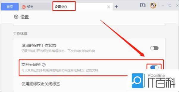 第三步:在新出现的设置中心界面,选择开启文档云同步,把右侧开关从左拨到右就开启了。
